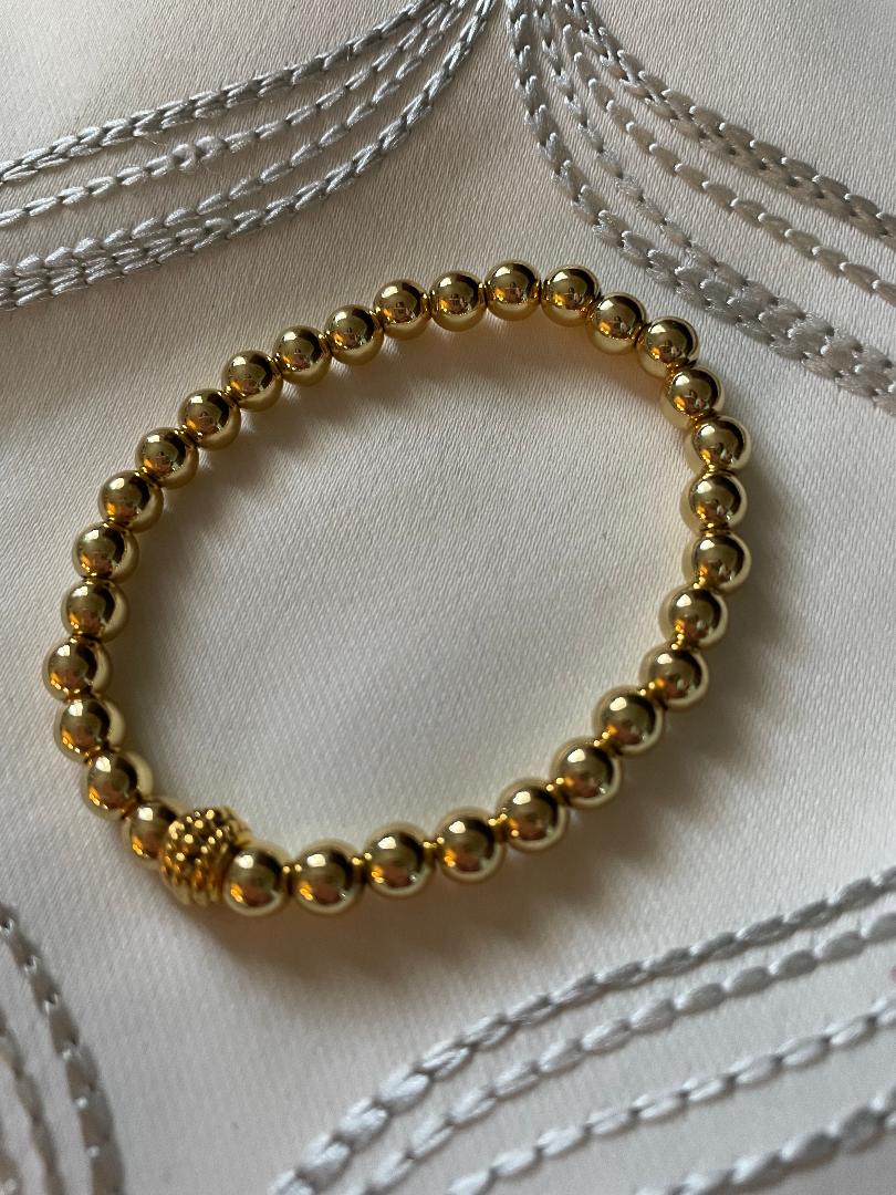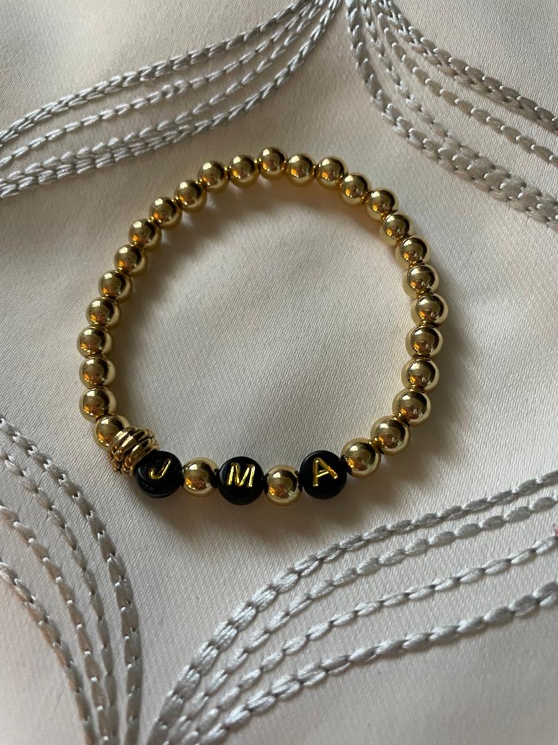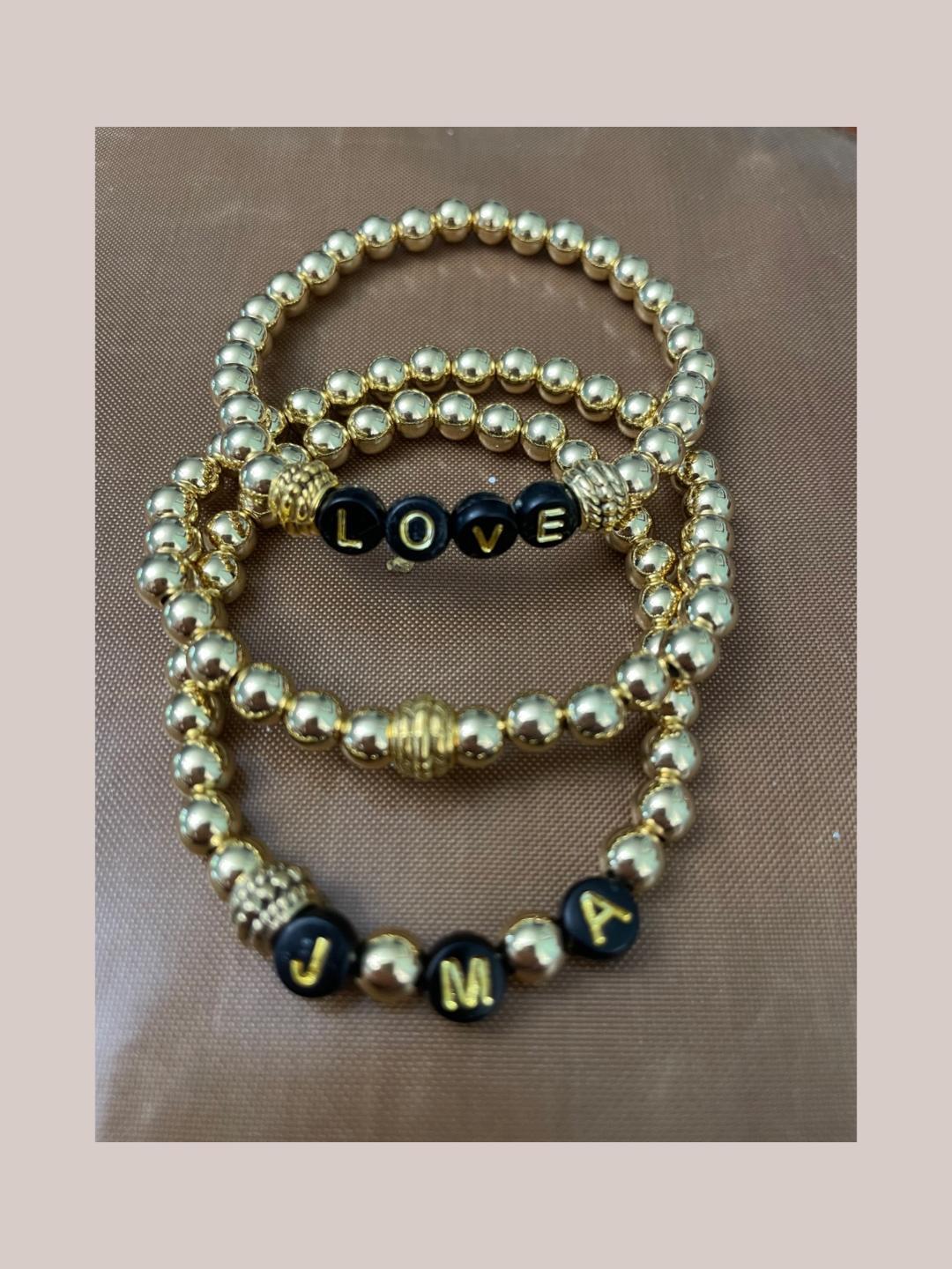 Set of Three 14k gold plated Bracelets, one just gold beads, one with three Initials (Black and Gold Beads), one with the word LOVE but can be any Word you'd like.