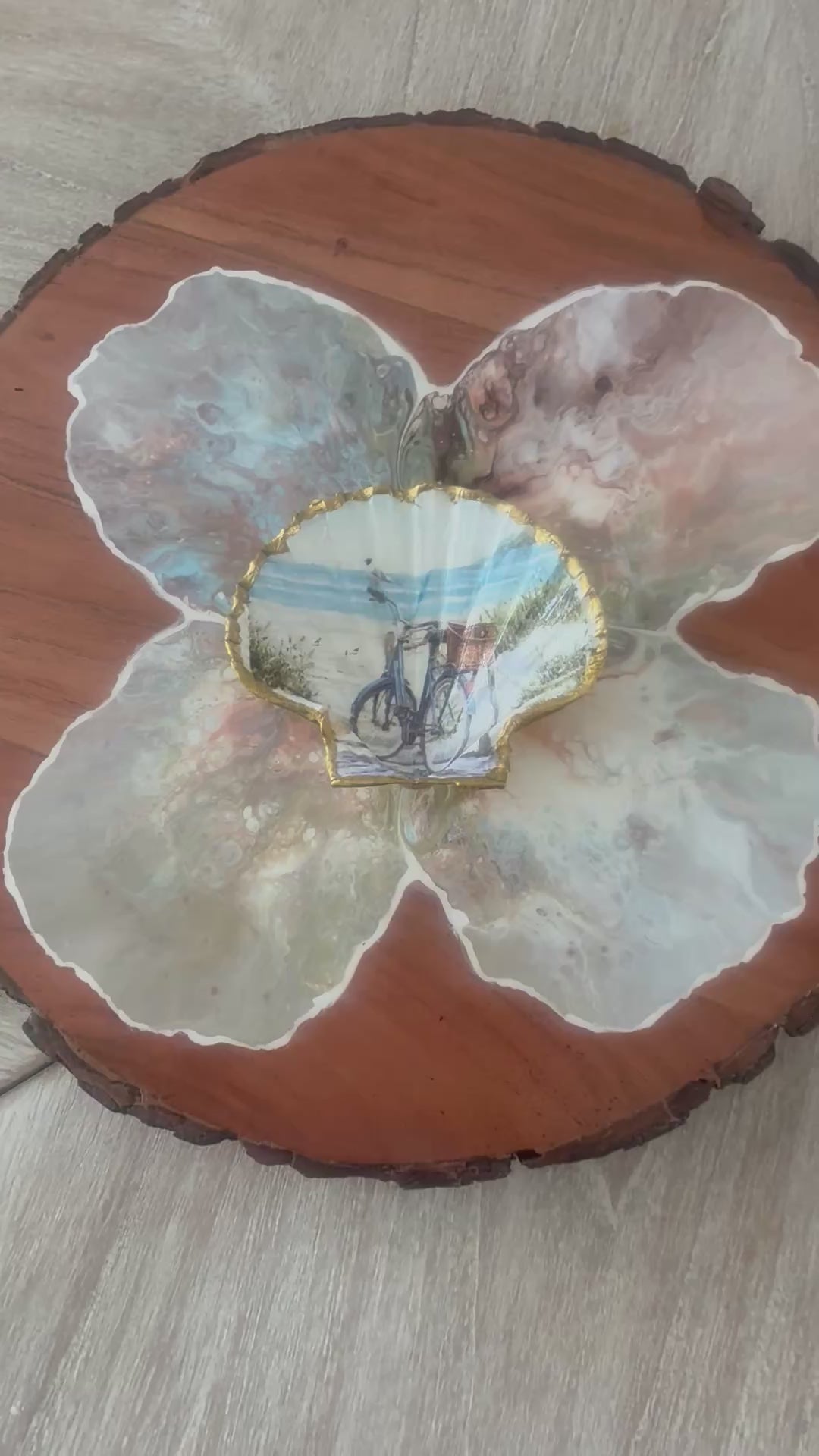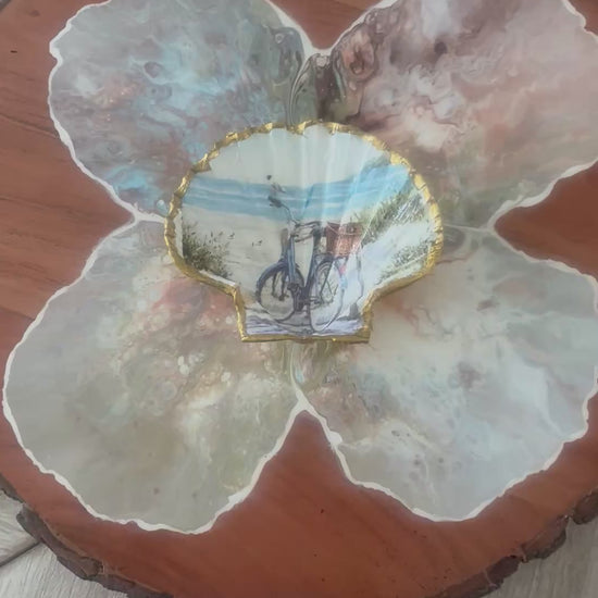 Bike parked at the Beach Large Scallop Shell. These are real Scallop Shells, hand panted, decoupaged and sealed for a decoration for any space. Place it on a nightstand or in any room to add a nautical touch to your home.