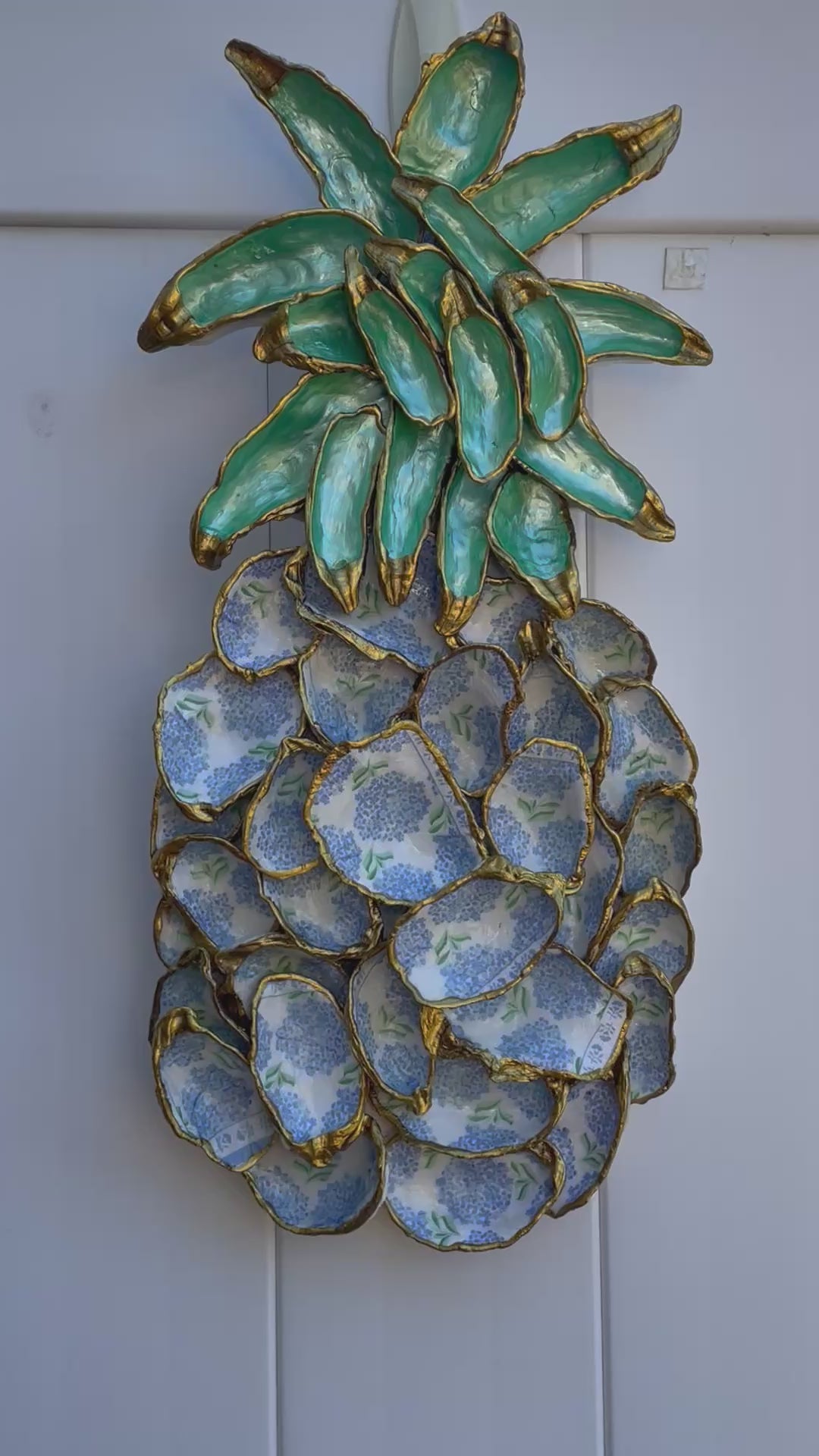 This distinctive pineapple artwork is crafted by hand using genuine oyster shells. Shells are decorated Blue and White Hydrangea patterns as depicted in the images and trimmed with a liquid gold boarder. Each piece varies slightly due to its handmade nature and natural shells. The shells are affixed to a wooden board shaped like a pineapple, equipped with a hook for easy wall mounting. This creation offers a sophisticated decorative element for your home and is available for immediate shipment.