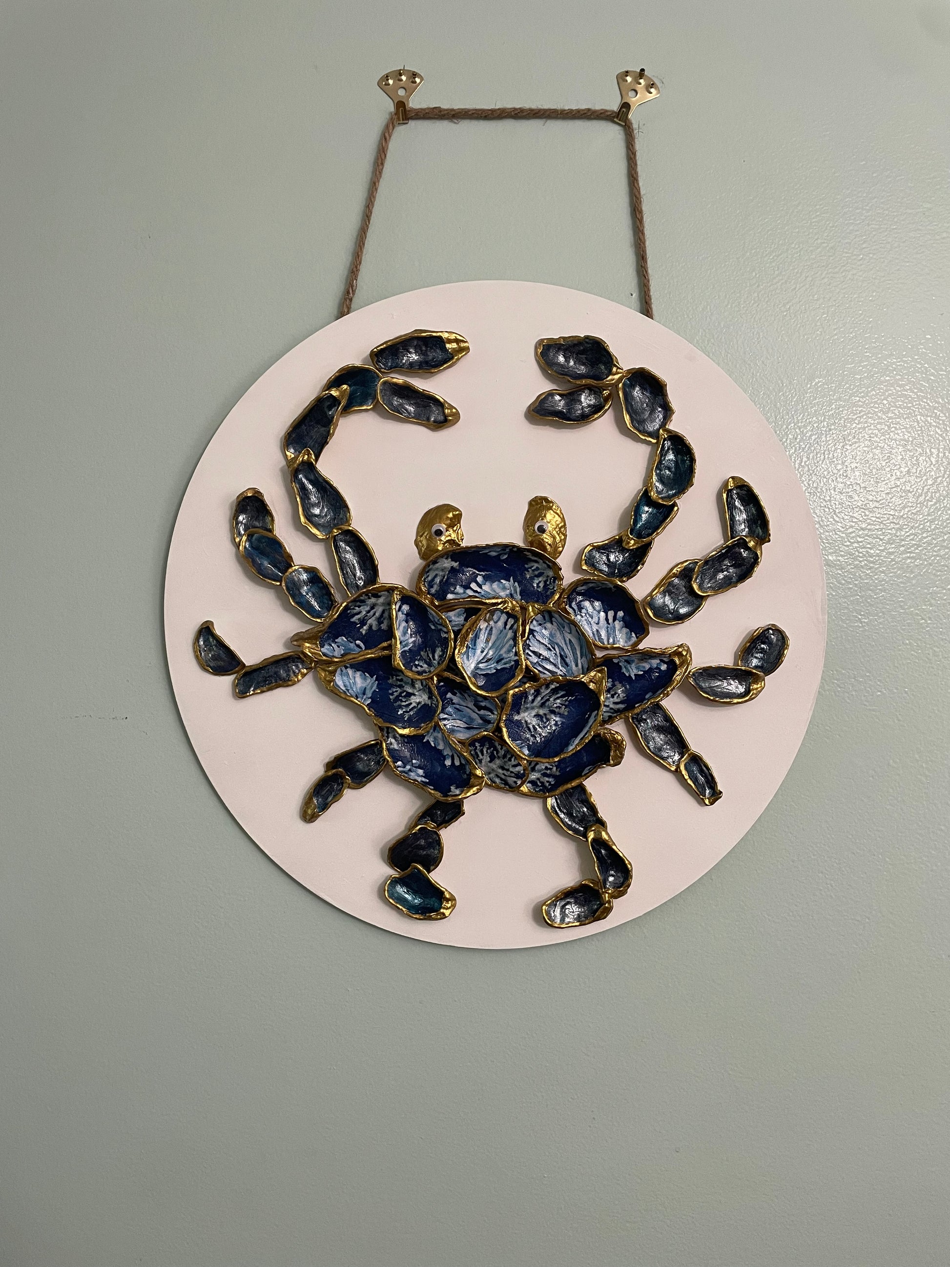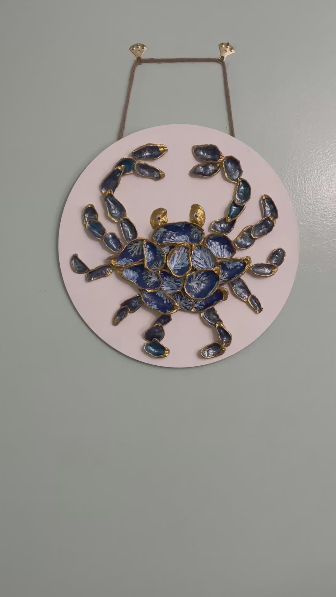 This distinctive artwork of a crab is crafted by hand using genuine oyster shells. Some shells are finished in gold and pearly white; others are a Coral Blue pattern as depicted in the images. Each piece varies slightly due to its handmade nature. You may see some gaps on the board where the oyster shells don't completely cover it. We try to make these gaps as small and not noticeable as we can. The shells are affixed to a wooden board 19" circular shape, equipped with a rope for easy wall mounting. This creation offers a sophisticated decorative element for your home and is available for immediate shipment.