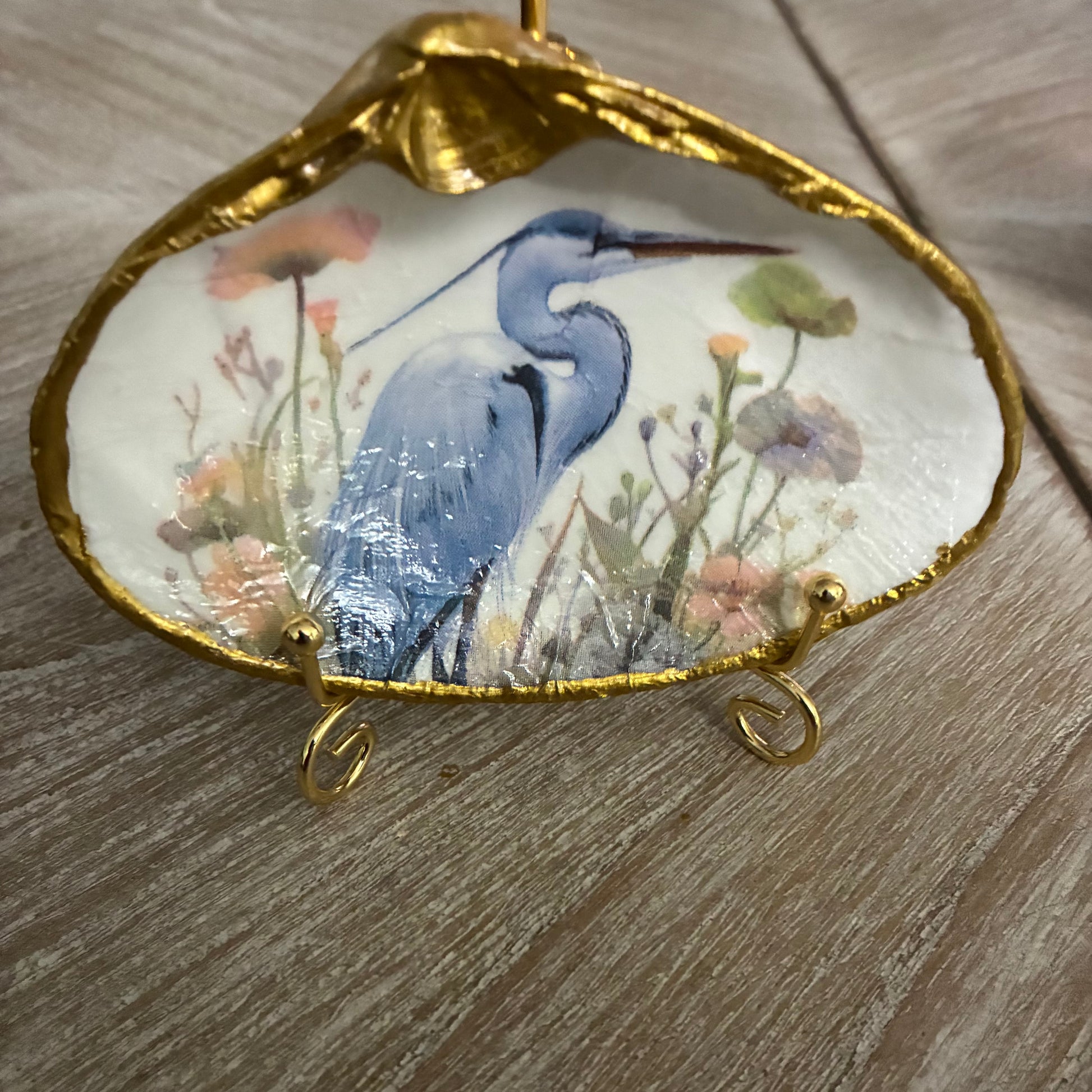 Blue Heron on Large Clam Shell. These are real Clam Shells, hand panted, decoupaged and sealed for a decoration for any space. Place it on a nightstand or in any room to add a nautical touch to your home.