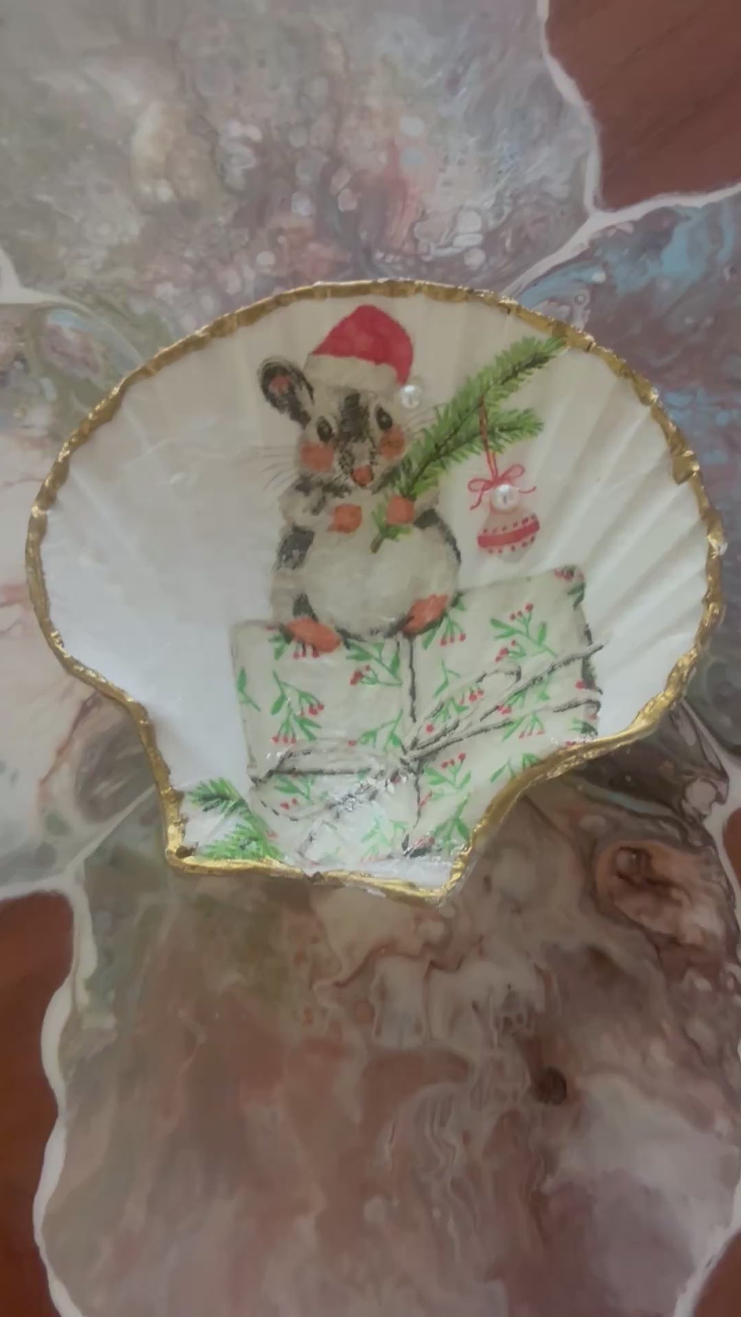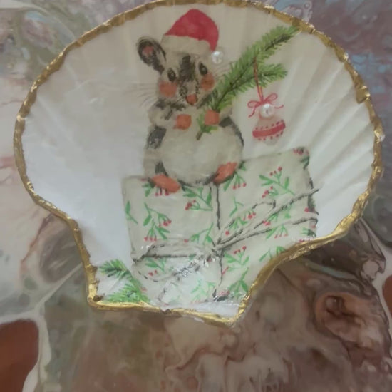 Christmas Mouse on Large Scallop Shell. Her hat & ornament are decorated with mini pearls. These are real Scallop Shells, hand panted, decoupaged and sealed for a decoration for any space. Place it on a nightstand or in any room to add a holiday touch to your home.