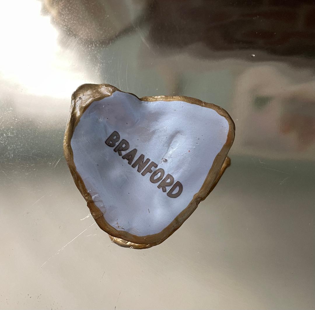 Branford CT Town Oyster Shell. These are real Oyster Shells from the CT shoreline, hand panted, trimmed in gold and sealed for a decoration for any space.