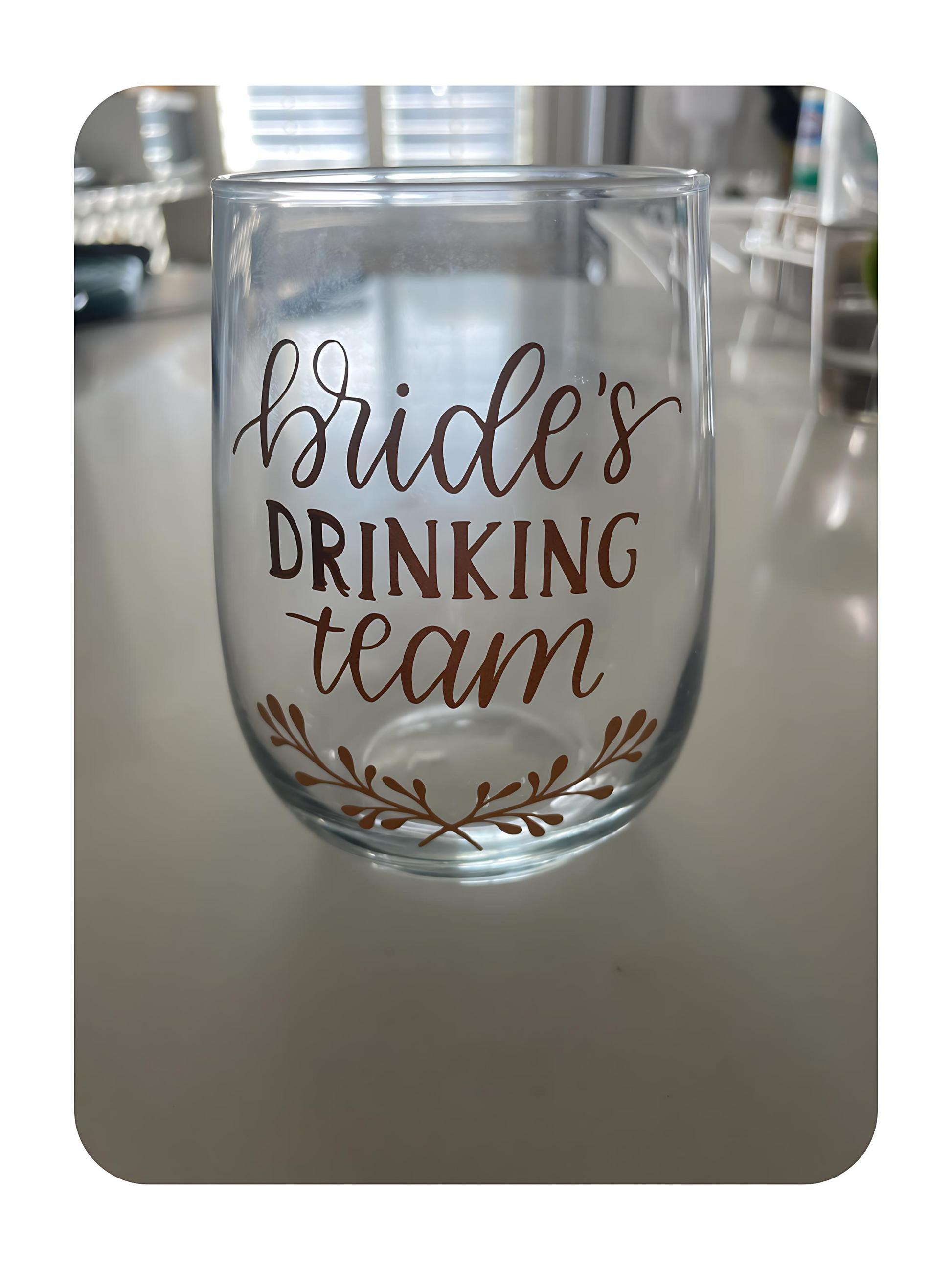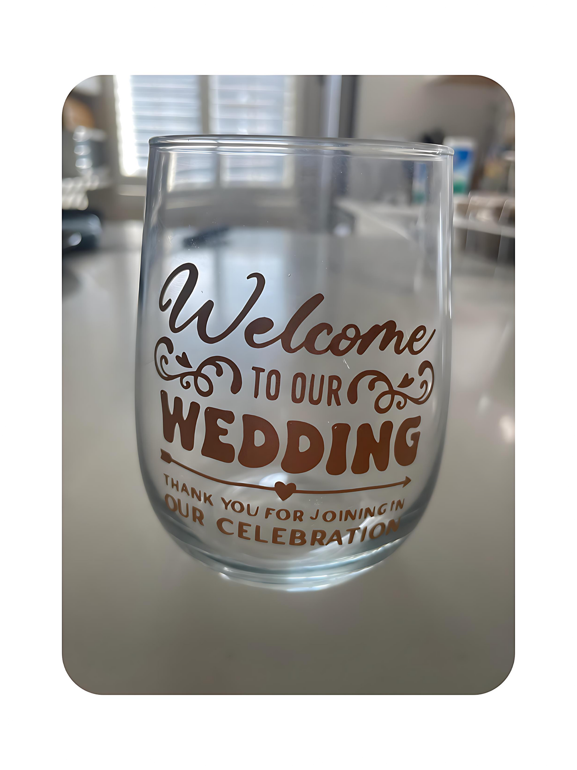 Personalized Glass 16oz clear stemless wine Glass, can be personalized for a wedding, engagement party, shower, anniversary party, or any special event Shown Personalized in gold writing. These make a lovely Favor for your guests.