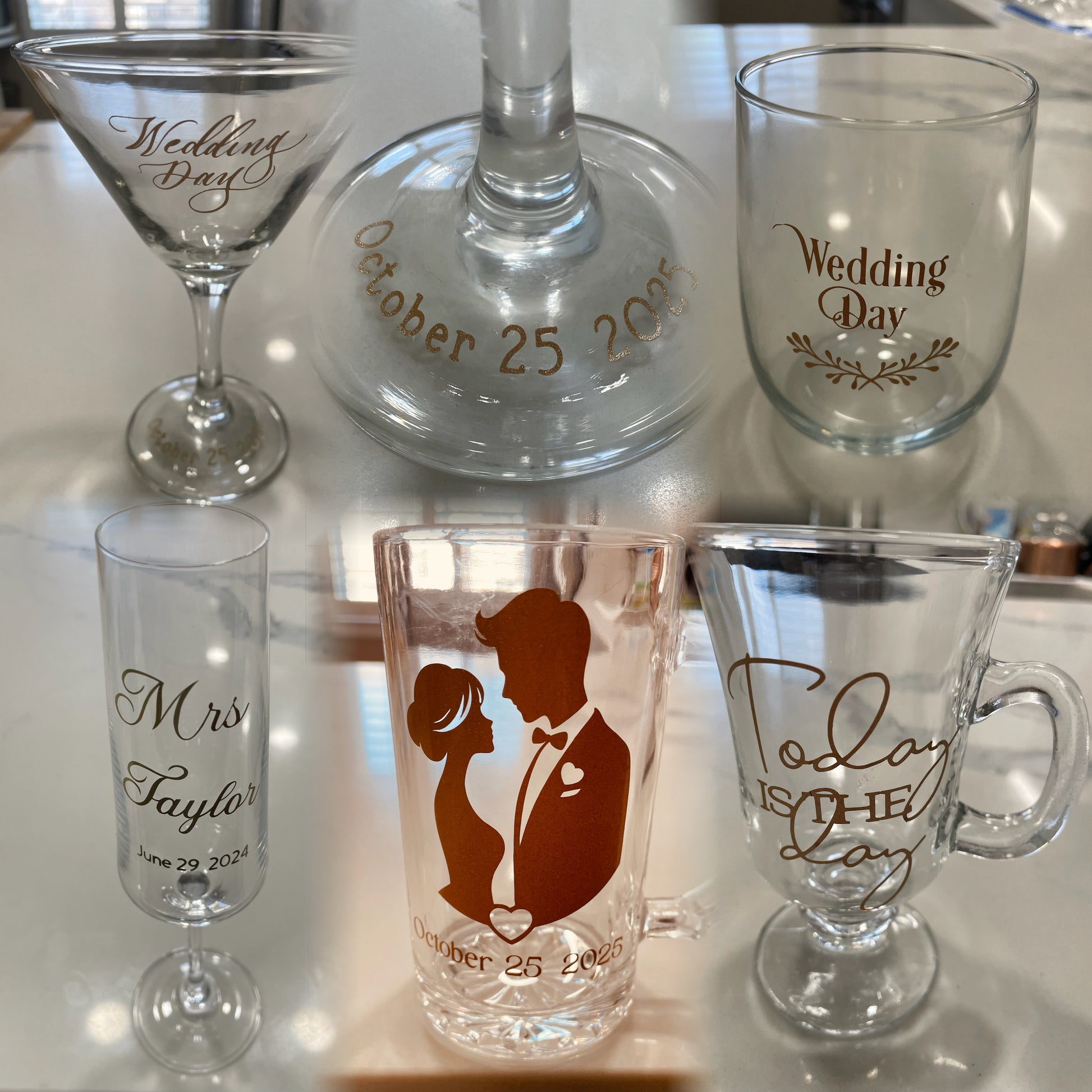 Personalized Wedding Favor Martini 7.25oz Glass. Elegant clear Martini Glass, can be personalized for a wedding, engagement party, shower, anniversary party, or any special event Shown Personalized in gold writing. Pictured with Wedding Day on Glass in Gold and wedding date around the rim. These make a lovely Favor for your guests. Can be personalized to include each quest name.