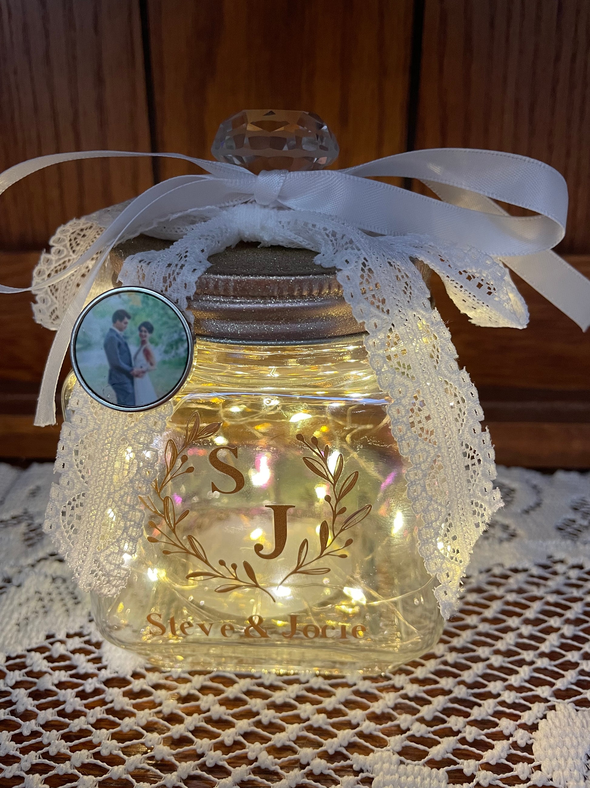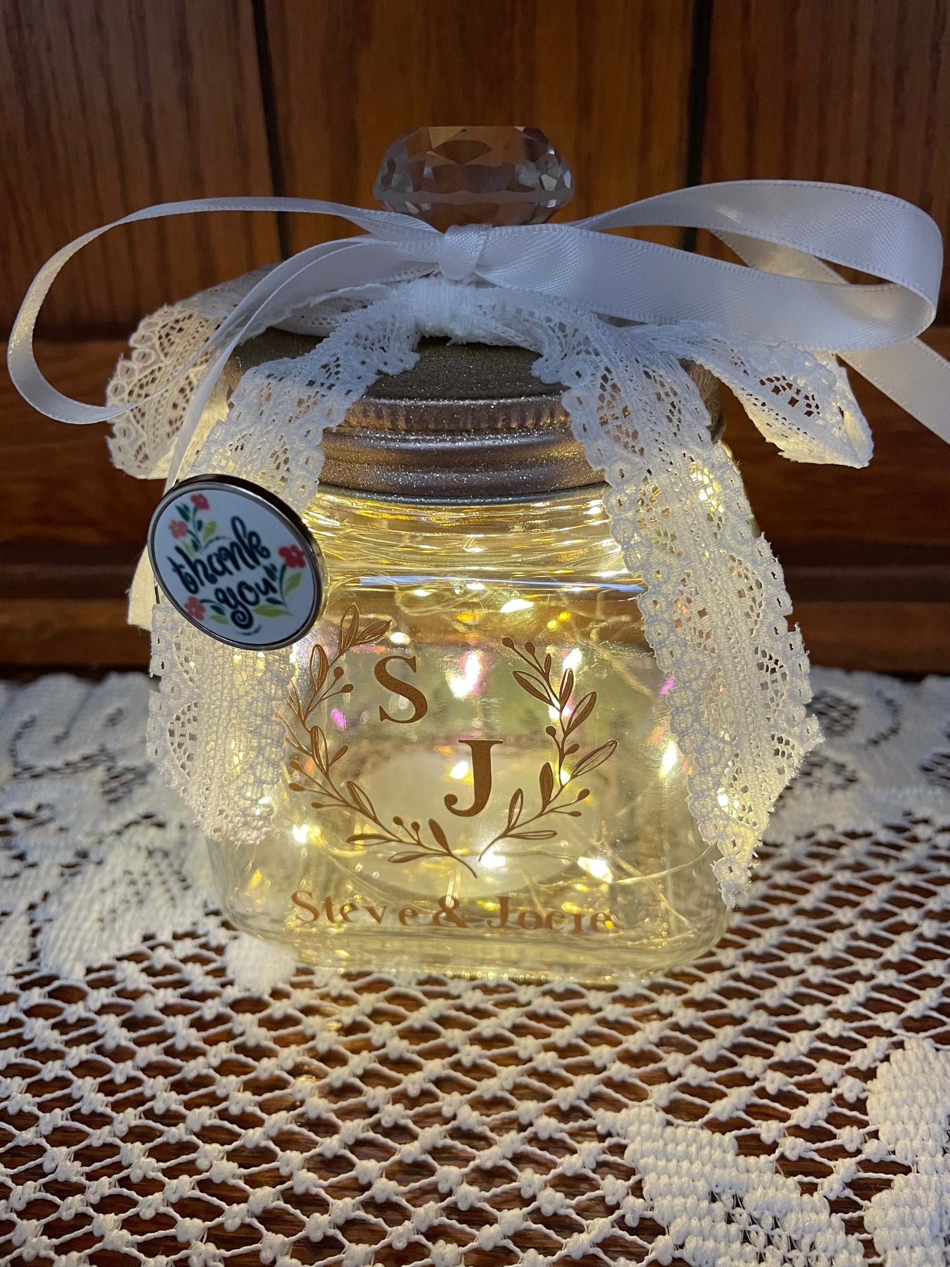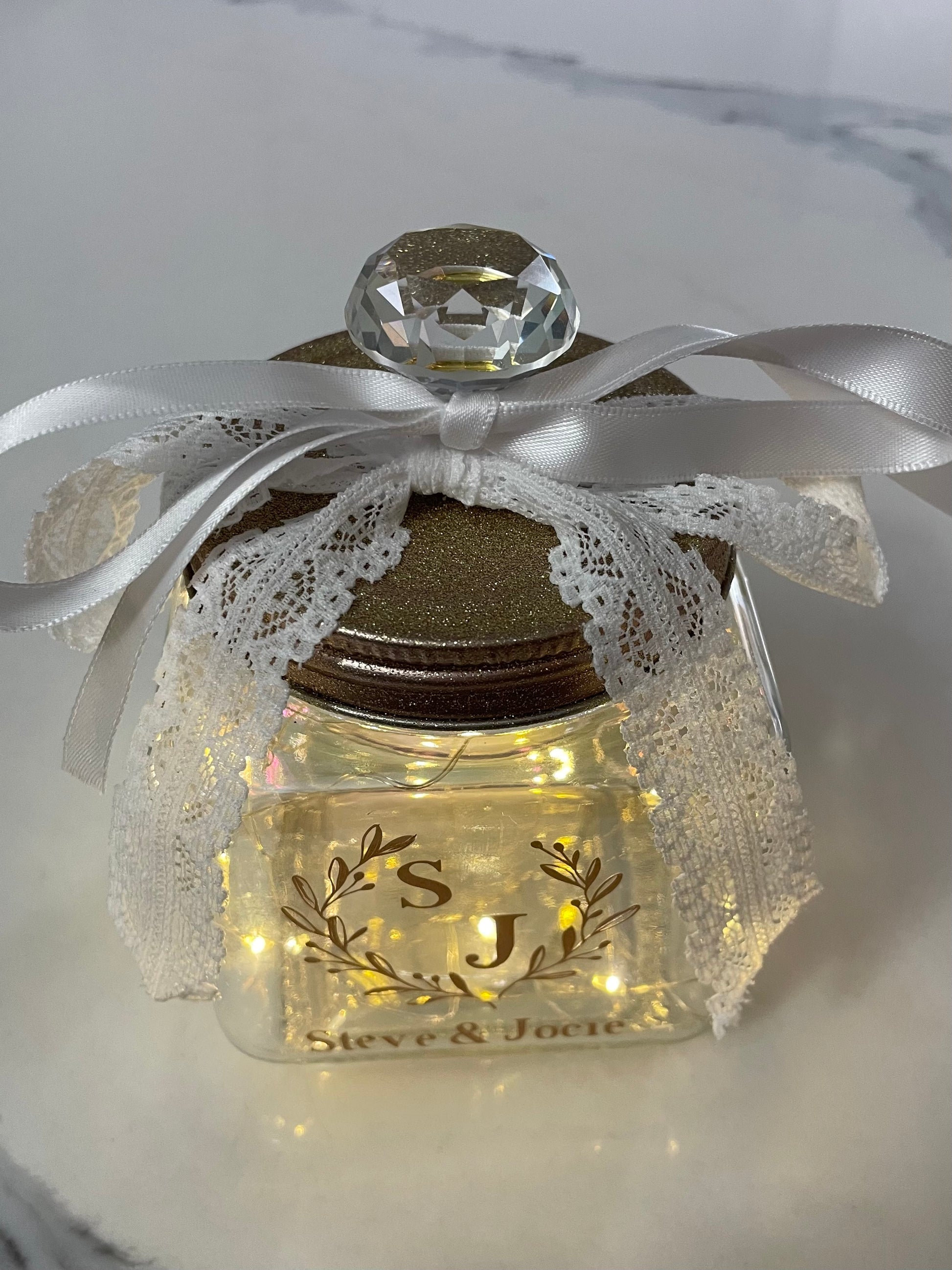 3" Square Glass Jar filled with LED Fairy Lights battery operated, white ribbons and topped with a 30mm Diamond crystal ball.