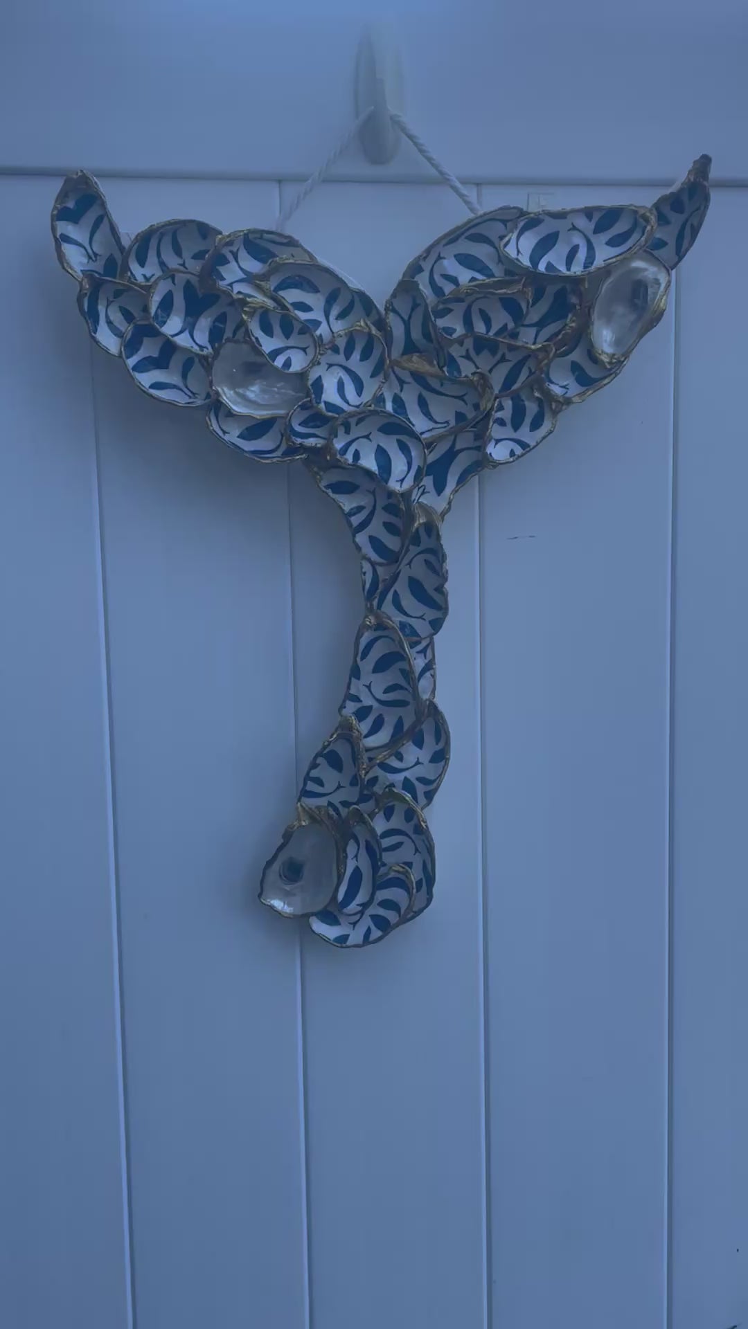 This distinctive Blue and White whales tail artwork is crafted by hand using genuine oyster shells. Shells are decorated in as depicted in the images. Each piece varies slightly due to its handmade nature. The shells are affixed to a wooden board shaped like a Whales Tail, equipped with a rope for easy wall mounting. This creation offers a sophisticated decorative element for your home and is available for immediate shipment.