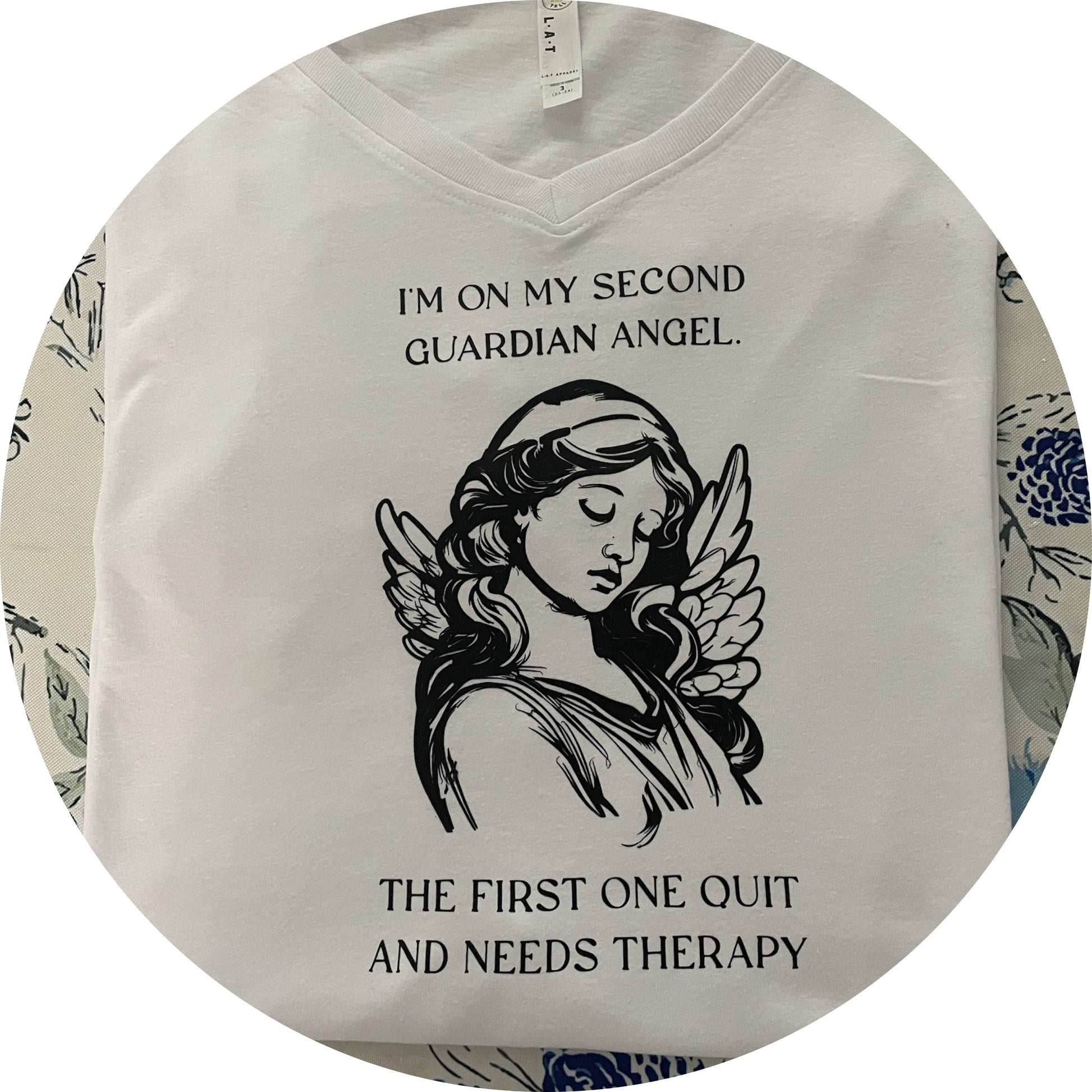 V-NECK T-shirt Saying: I'm on my second Guardian Angel. The first one quit and needs therapy.
