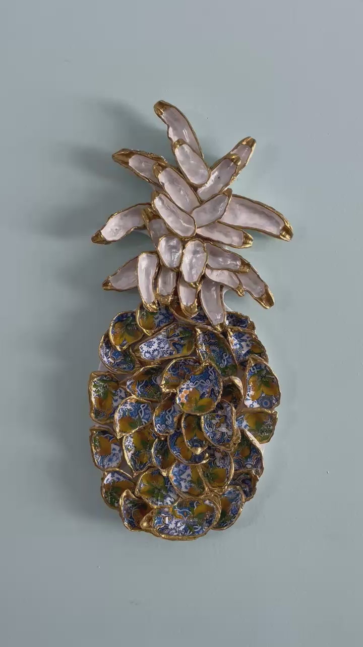 This distinctive pineapple artwork is crafted by hand using genuine oyster shells. Shells are decorated Blue, White and Lemon pattern, leaves are white, pearl and liquid gold trim. Each piece varies slightly due to its handmade nature and natural shells. The shells are affixed to a wooden board shaped like a pineapple, equipped with a hook for easy wall mounting. This creation offers a sophisticated decorative element for your home and is available for immediate shipment.