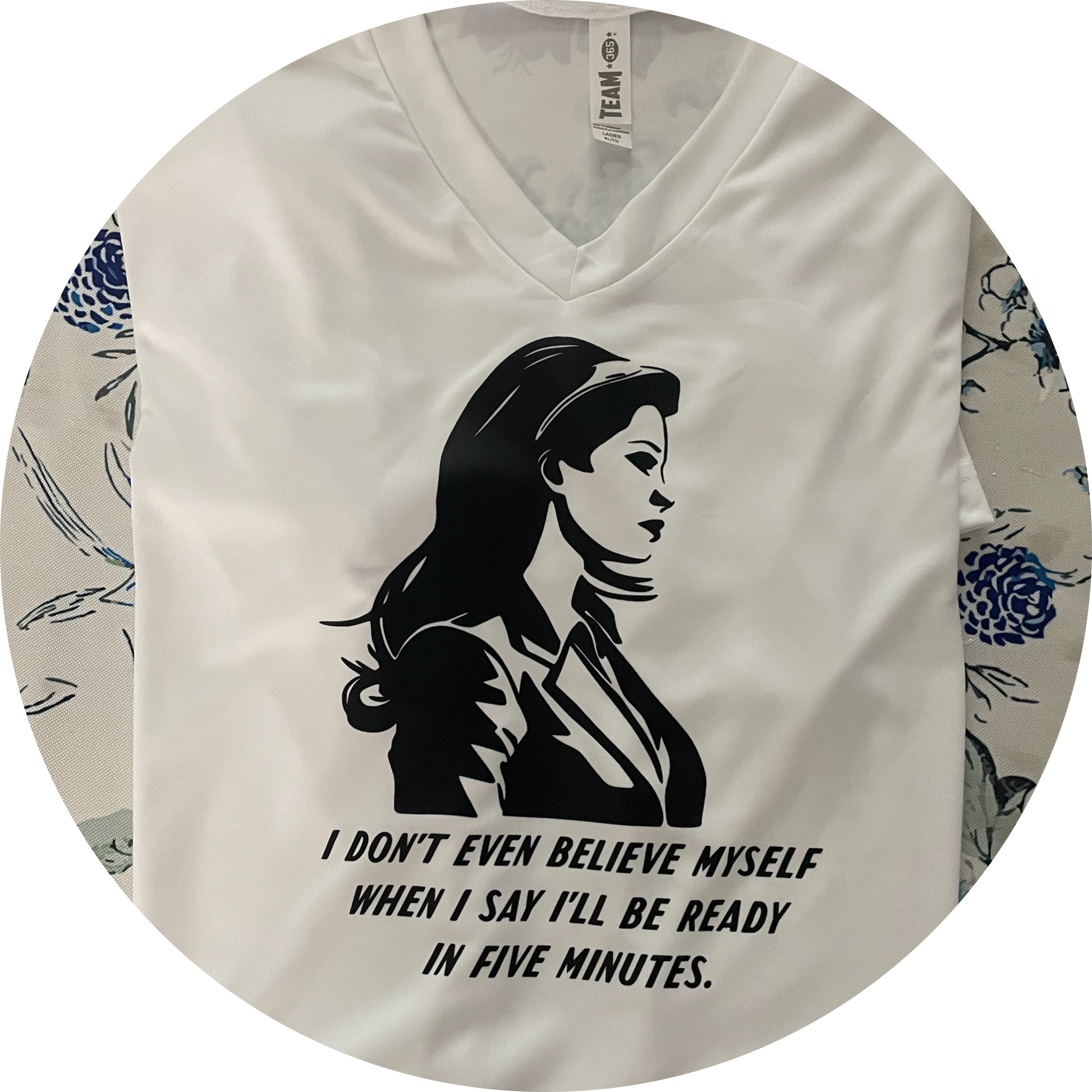V-NECK T-shirt Saying: I don't even believe myself when I say I'll be ready in five minutes.
