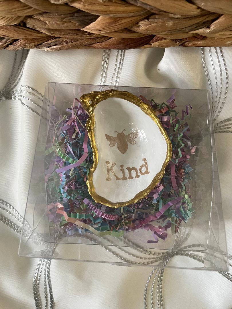 Oyster Shell with Inspirational message. Reads: Be (Bumble Bee) Kind. Each one is unique in size and all vary slightly. Oyster Shell hand painted and sealed for a beautiful touch. 4x4x2" clear box included and filled with colorful crinkle cut paper. Ready to Gift.