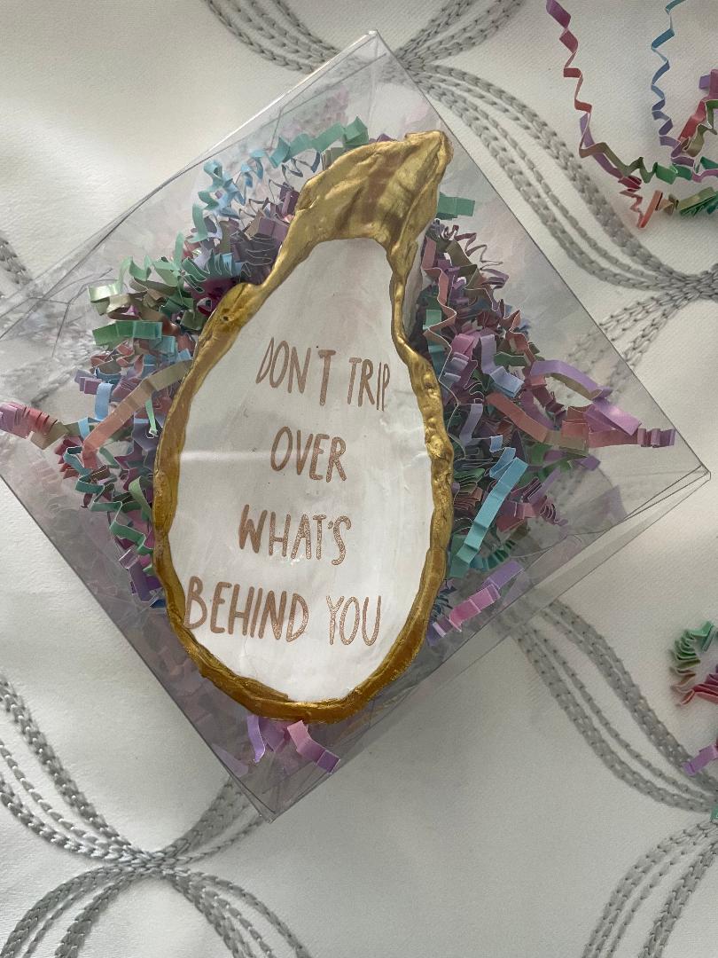 Oyster Shell with Inspirational message. Reads: Don't Trip Over What's Behind you. Each one varies slightly.in shape and size. Oyster Shell hand painted and sealed for a beautiful touch. 4x4x2" clear box included and filled with colorful crinkle cut paper. Ready to Gift.