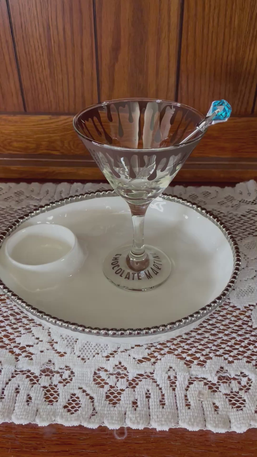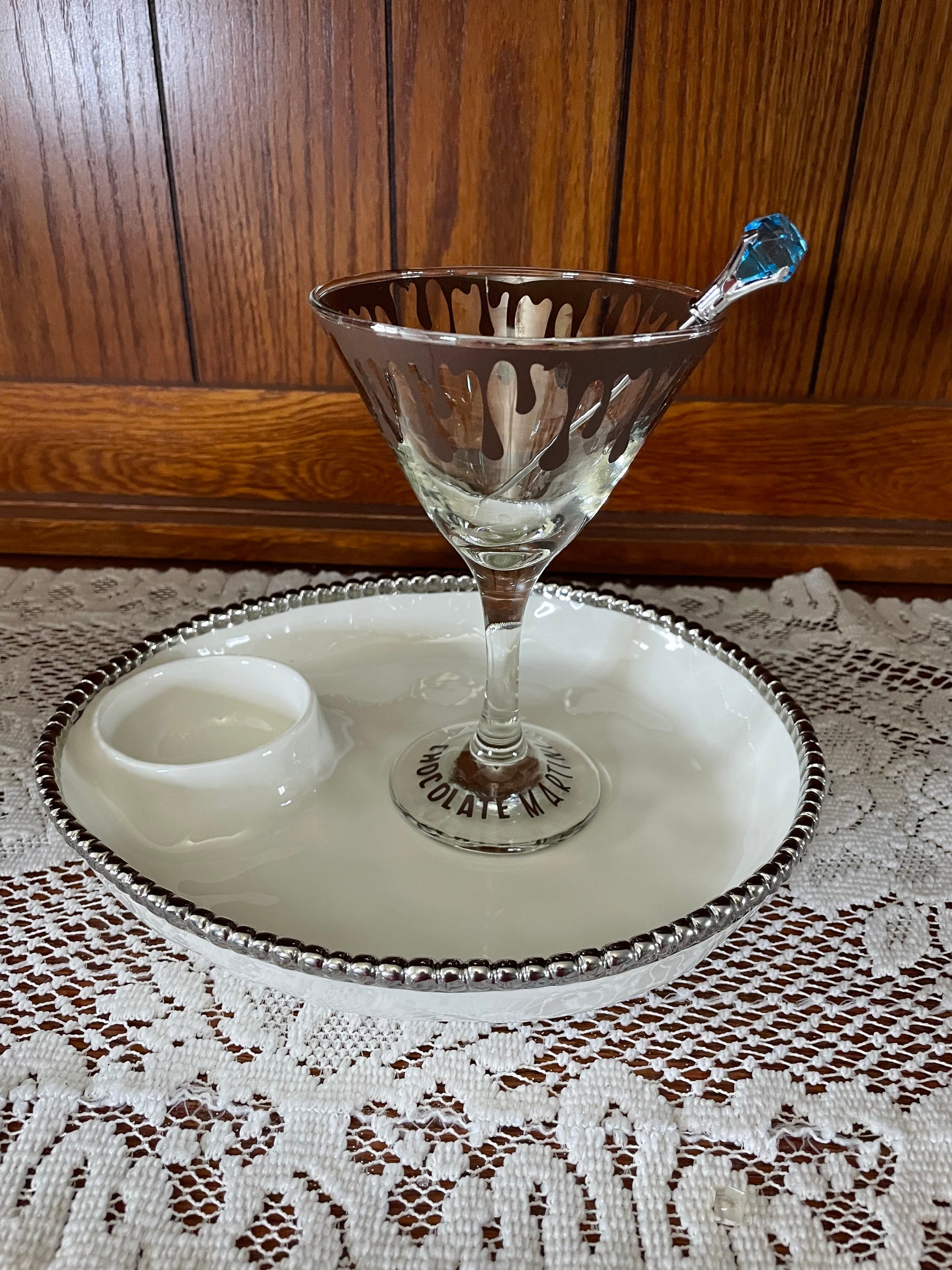 This 8 ounce glass Martini Glass reads Chocolate Martini around the rim. Chocolate dripping down the sides of the glass. Perfect little gift for the person who loves a good Martini.