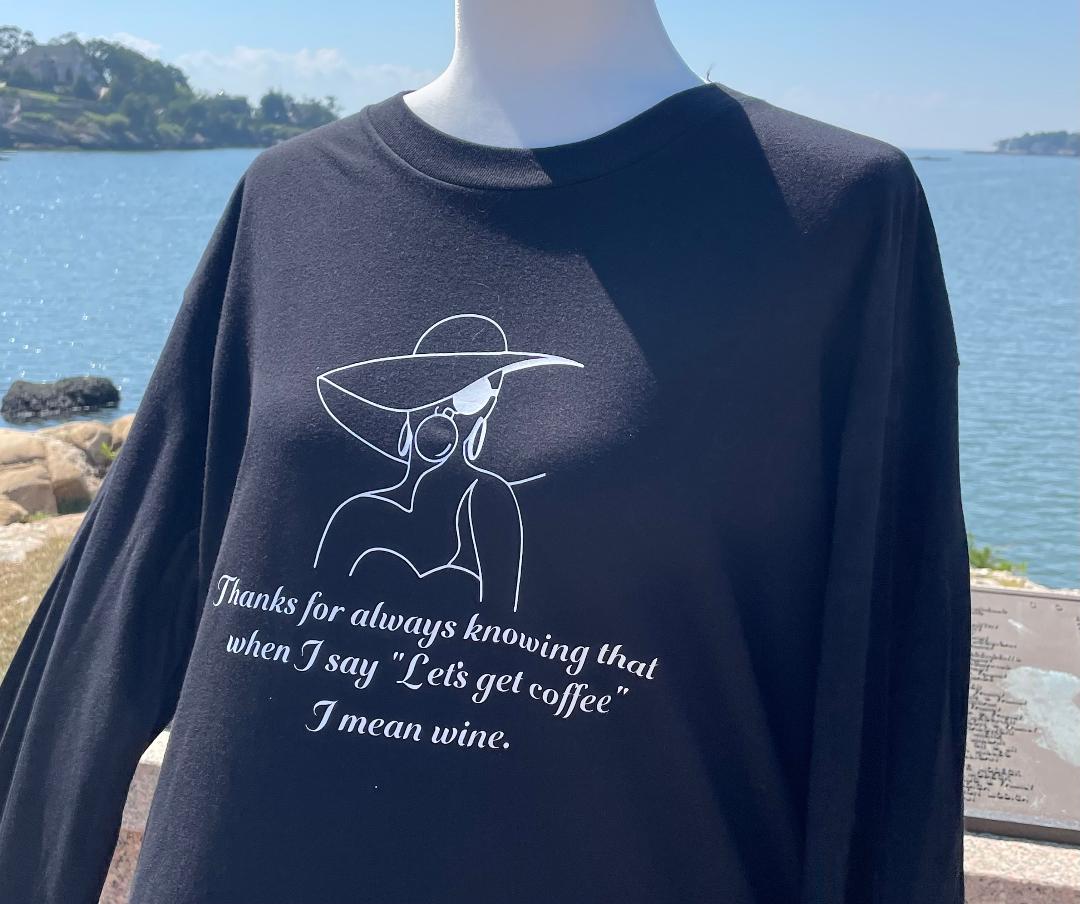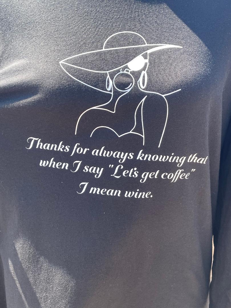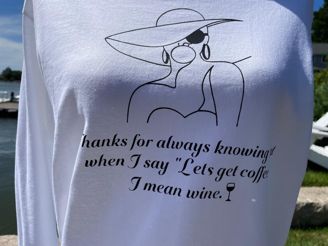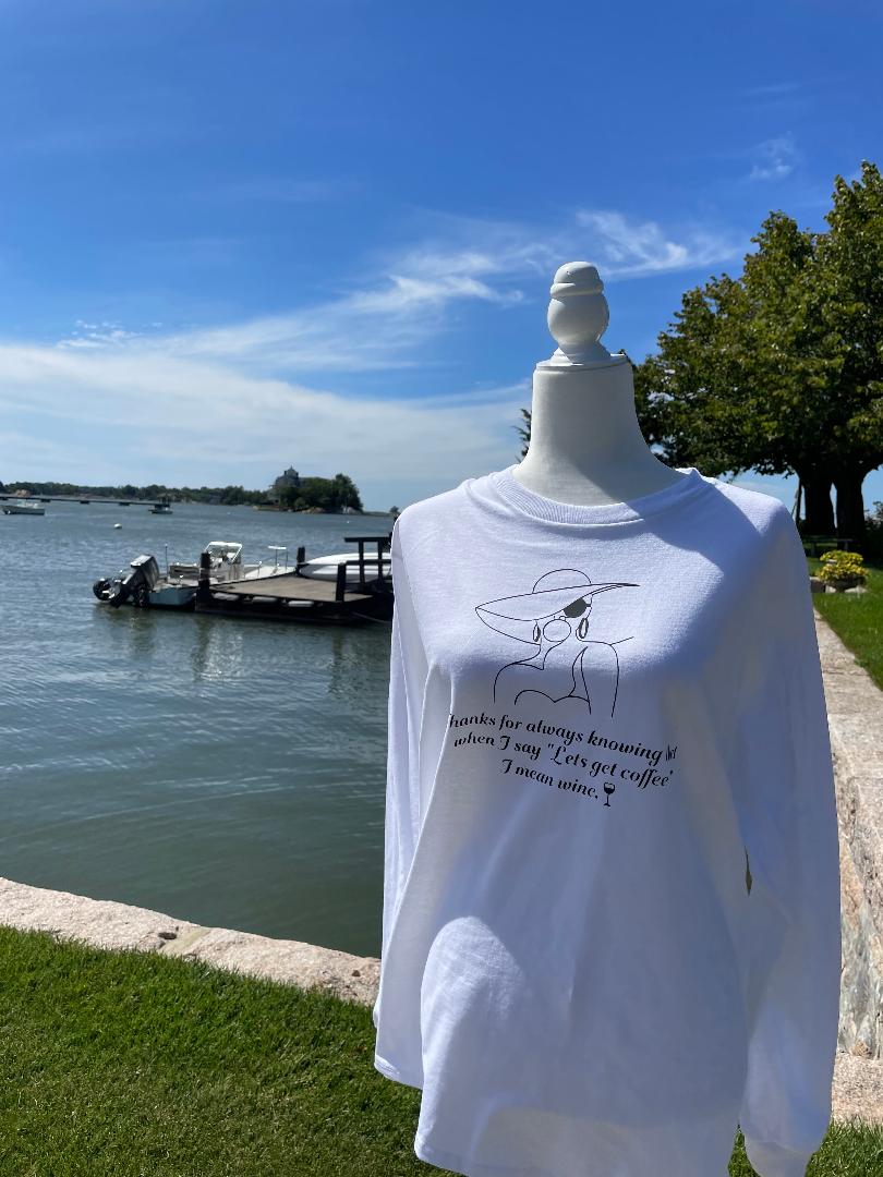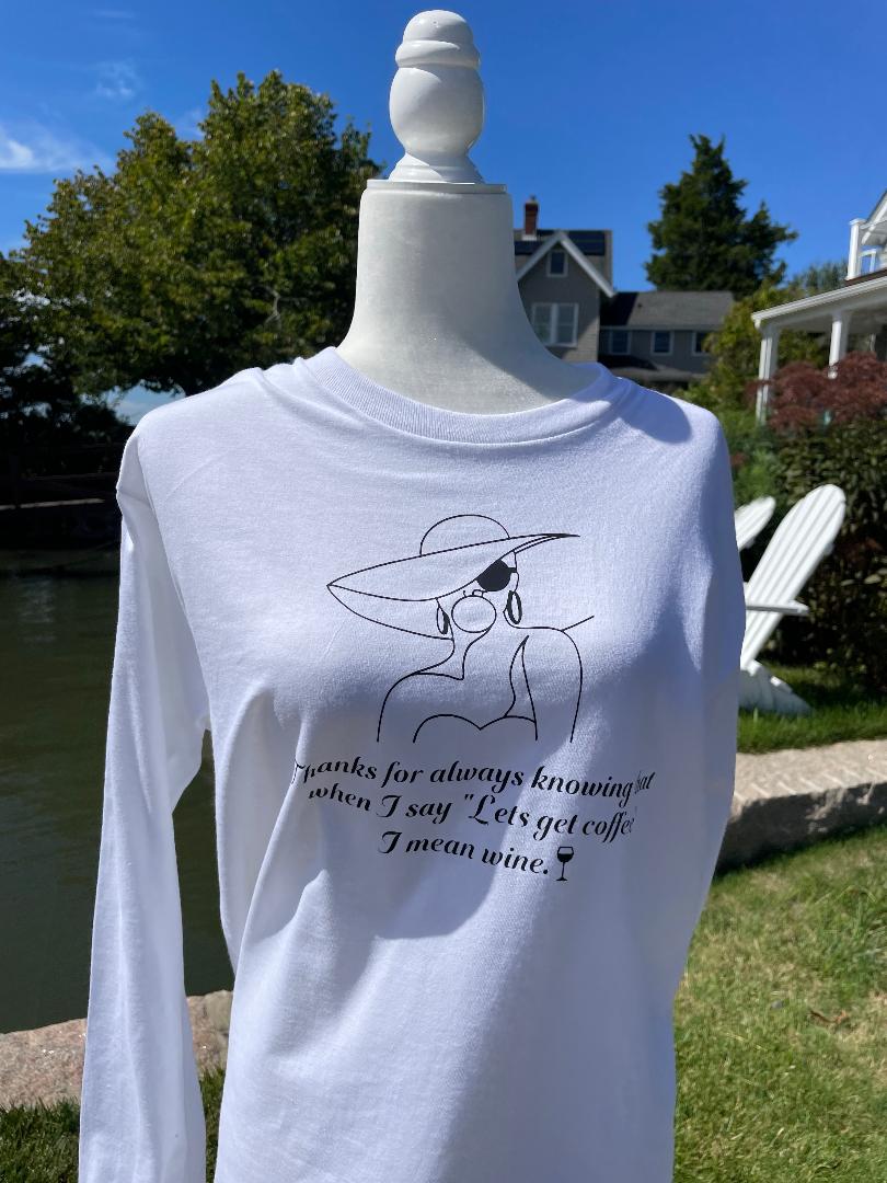 Available in White or Black. Long Sleeve T-shirt with Black Vinyl wording "Thanks for always knowing when I say "Let's get coffee" I mean wine!