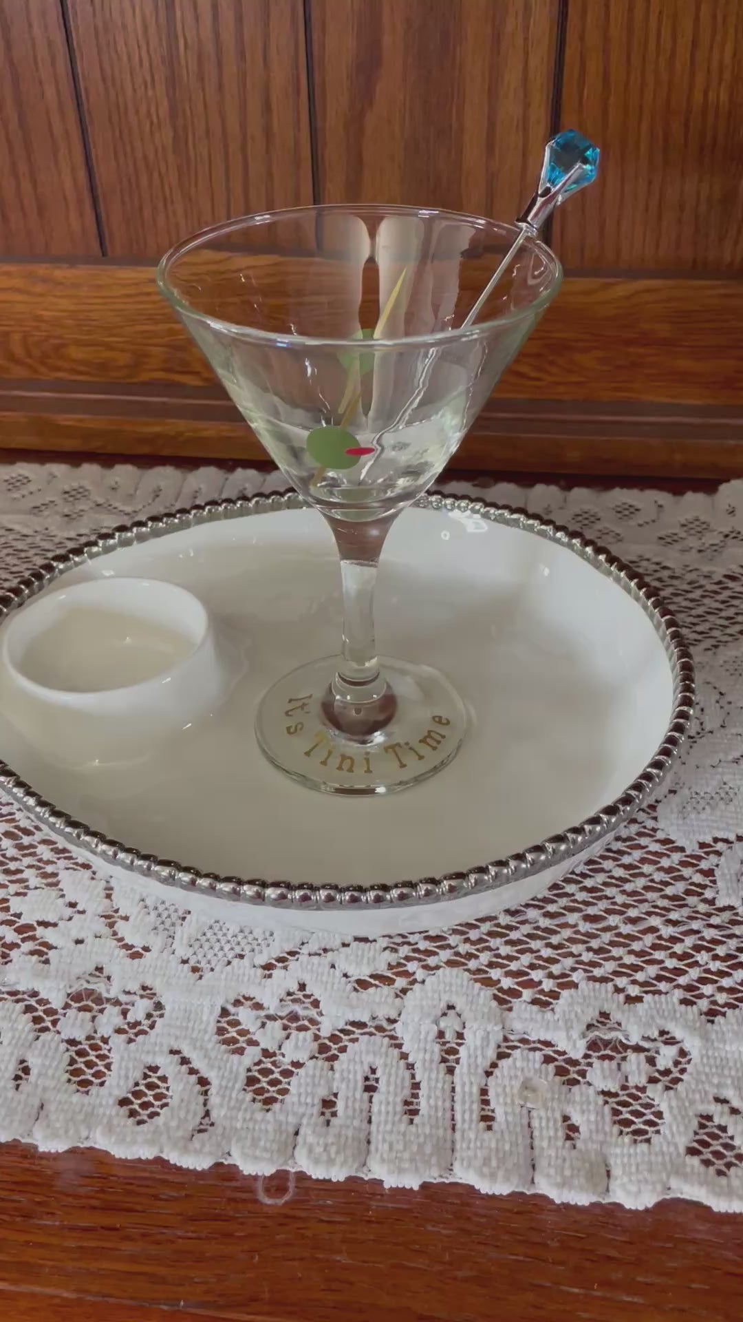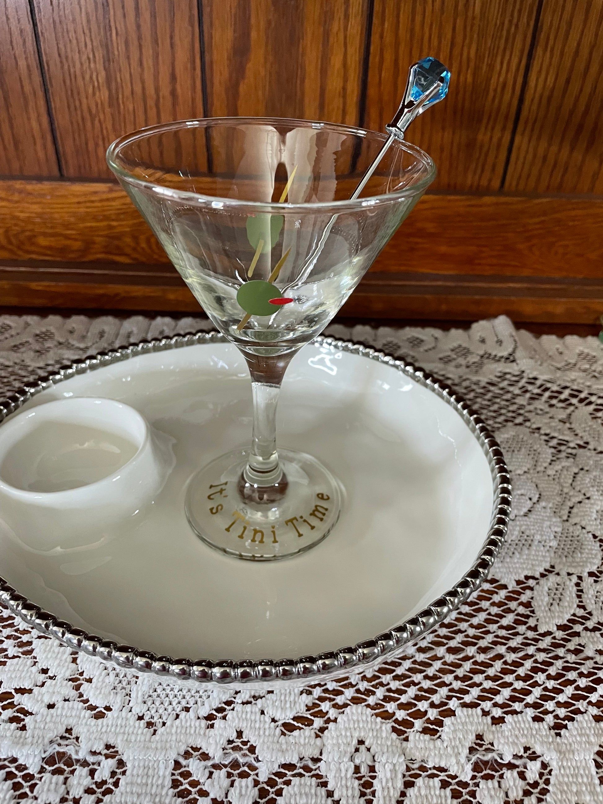 This 8 ounce Martini Glass reads It's Tini Time on rim. On the front and back of the glass Olive with Pick going through it. This is a perfect little gift for the person who loves a good Martini.