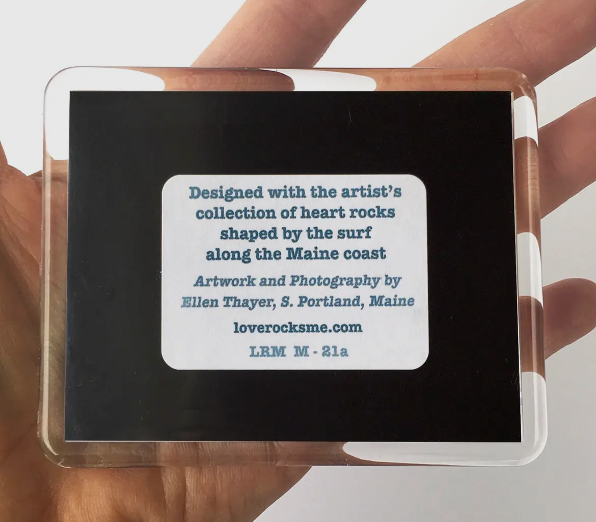 Nantucket Whale Magnet 3 3/4 x 3 1/2" acrylic magnet with 1/4" depth New England Made Product in cello bag. Designed with the artist’s collection of heart rocks shaped by the surf along the Maine coast