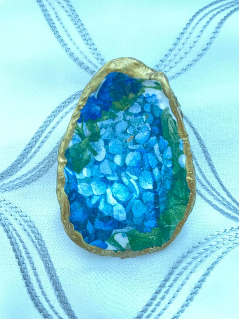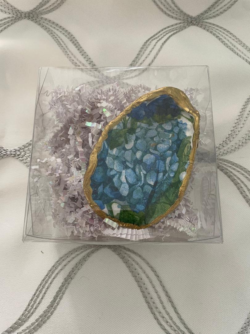Oyster Shell with decoupage Hydrangea. Sizes and Shape all vary slightly. Oyster Shell hand painted and sealed for a beautiful touch. 4x4x2" clear box included and filled with colorful crinkle cut paper. Ready to Gift.