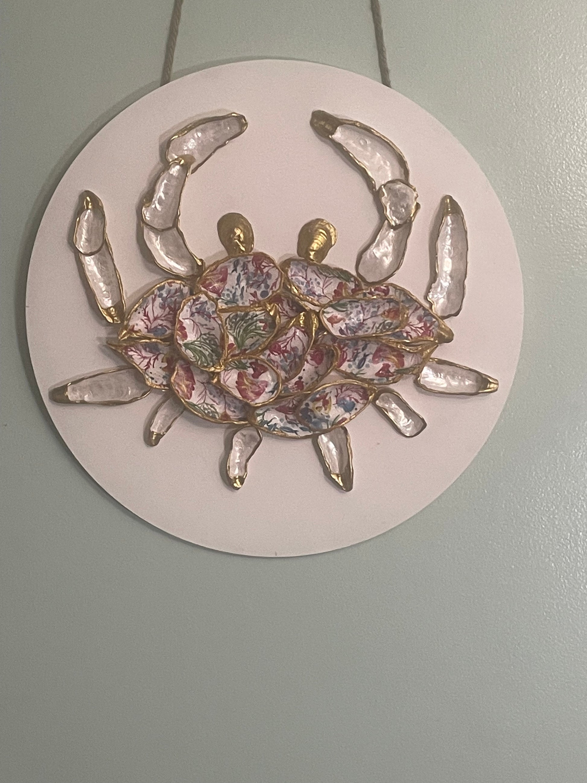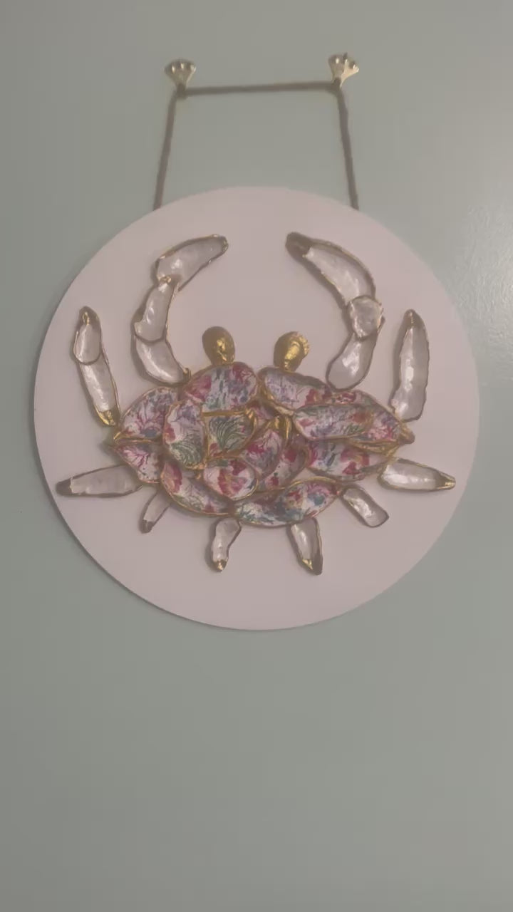 This distinctive artwork of a crab is crafted by hand using genuine oyster shells. Some shells are finished in gold and pearly white, others are a Caribbean Sea pattern as depicted in the images. Each piece varies slightly due to its handmade nature. You may see some gaps on the board where the oyster shells don't completely cover it. We try to make these gaps as small and not noticeable as we can. The shells are affixed to a wooden board 19" circular shape, equipped with a rope for easy wall mounting. This creation offers a sophisticated decorative element for your home and is available for immediate shipment.