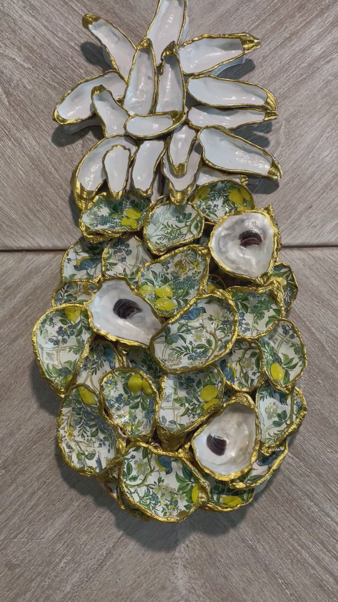 This distinctive pineapple artwork is crafted by hand using genuine oyster shells. Shells are decorated in a bird on lemon tree patterns as depicted in the images and a couple Natural shells finished with pearl white paint and trimmed with a gold boarder. Each piece varies slightly due to its handmade nature. The shells are affixed to a wooden board shaped like a pineapple, equipped with a hook for easy wall mounting. This creation offers a sophisticated decorative element for your home and is available for immediate shipment.