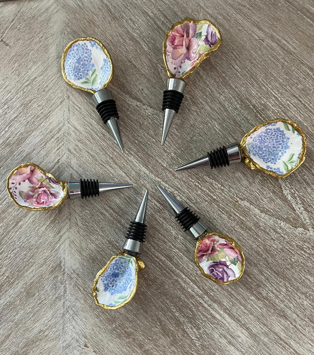 Materials: Oyster Shell, stainless steel and silicone wine stopper, Decoupage Material, Gloss, Sealer. Gift Box included