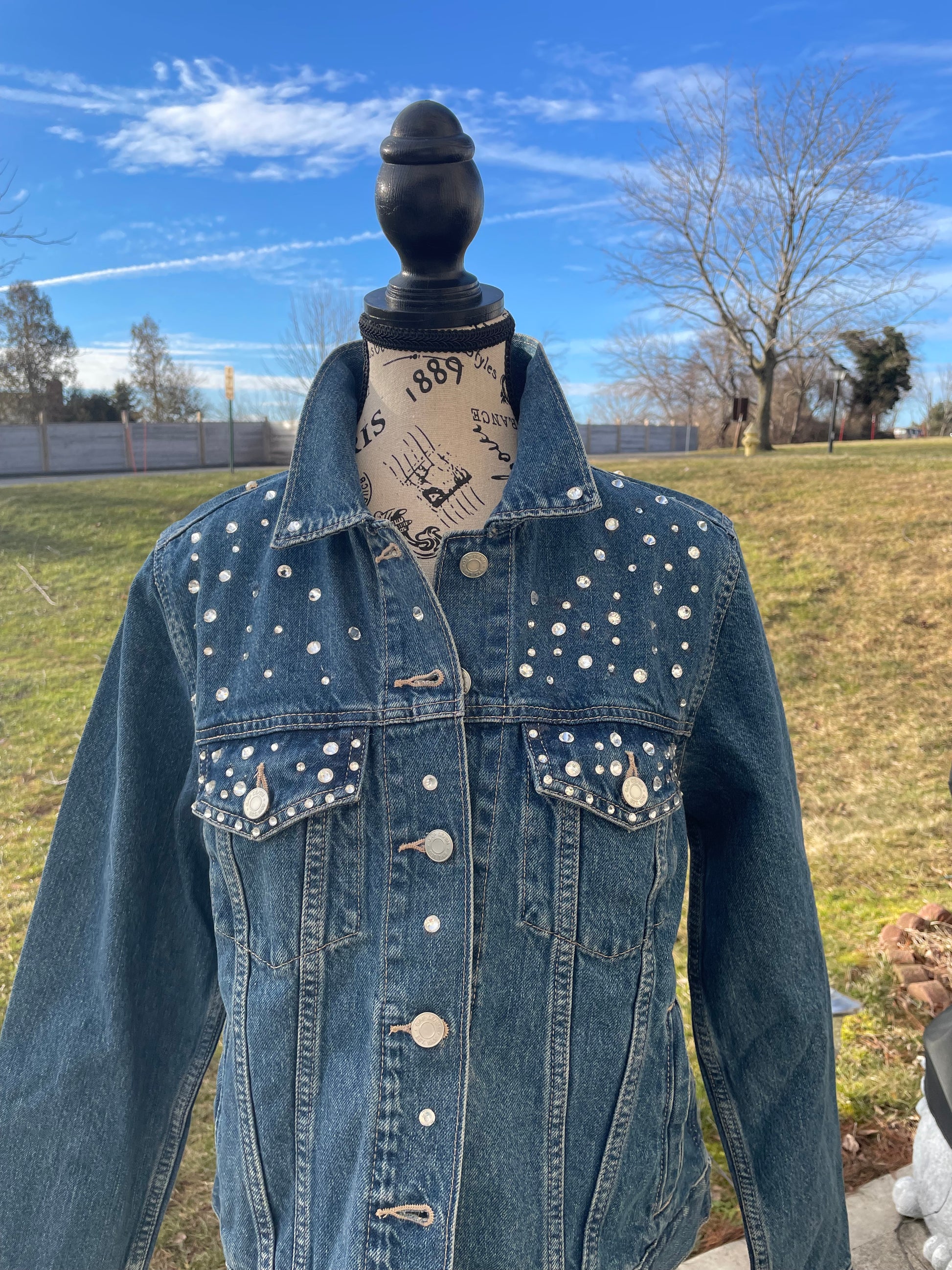 Bride or Wifey Denim Jacket decorated with Pearl Beads, Crystal Rhinestones Round Gems with Chenille Embroidered Patch Personalized Letters spelling out Bride or Wifey. ALSO available in White Vinyl lettering AND All Pearl Lettering and accents.