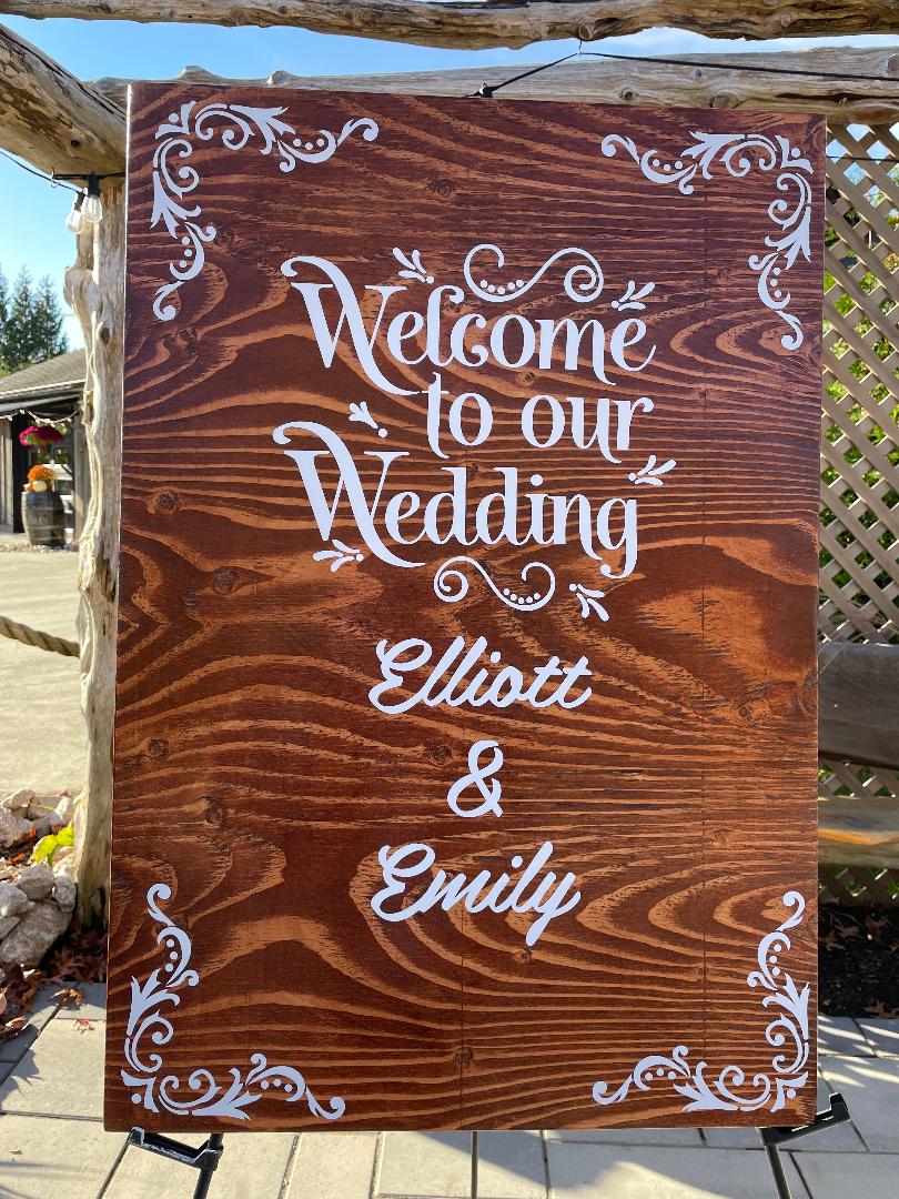 Corner Frames in white vinyl. Rustic yet Elegant reads, "Welcome to our Wedding Your Name and your wedding date" This wooden sign measures 22" x 32" and can be customized with any wording, different fonts shown others available as well. Vinyl color of your choice. Easel not included.