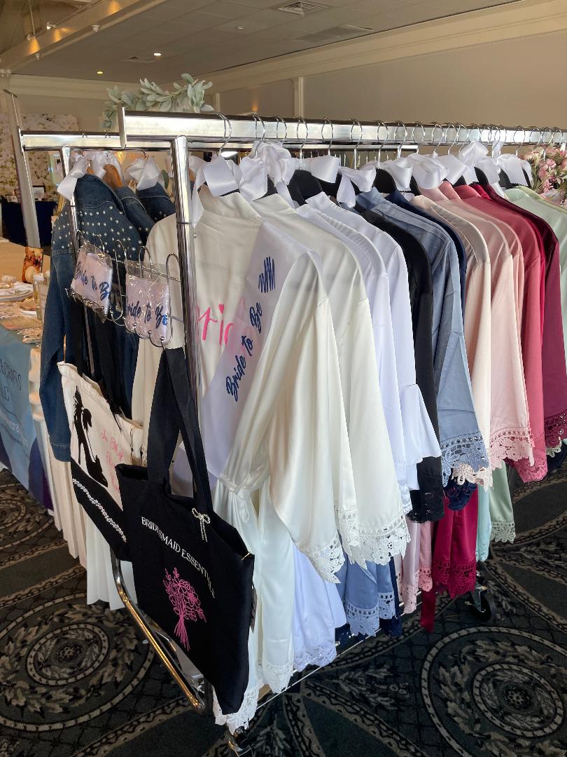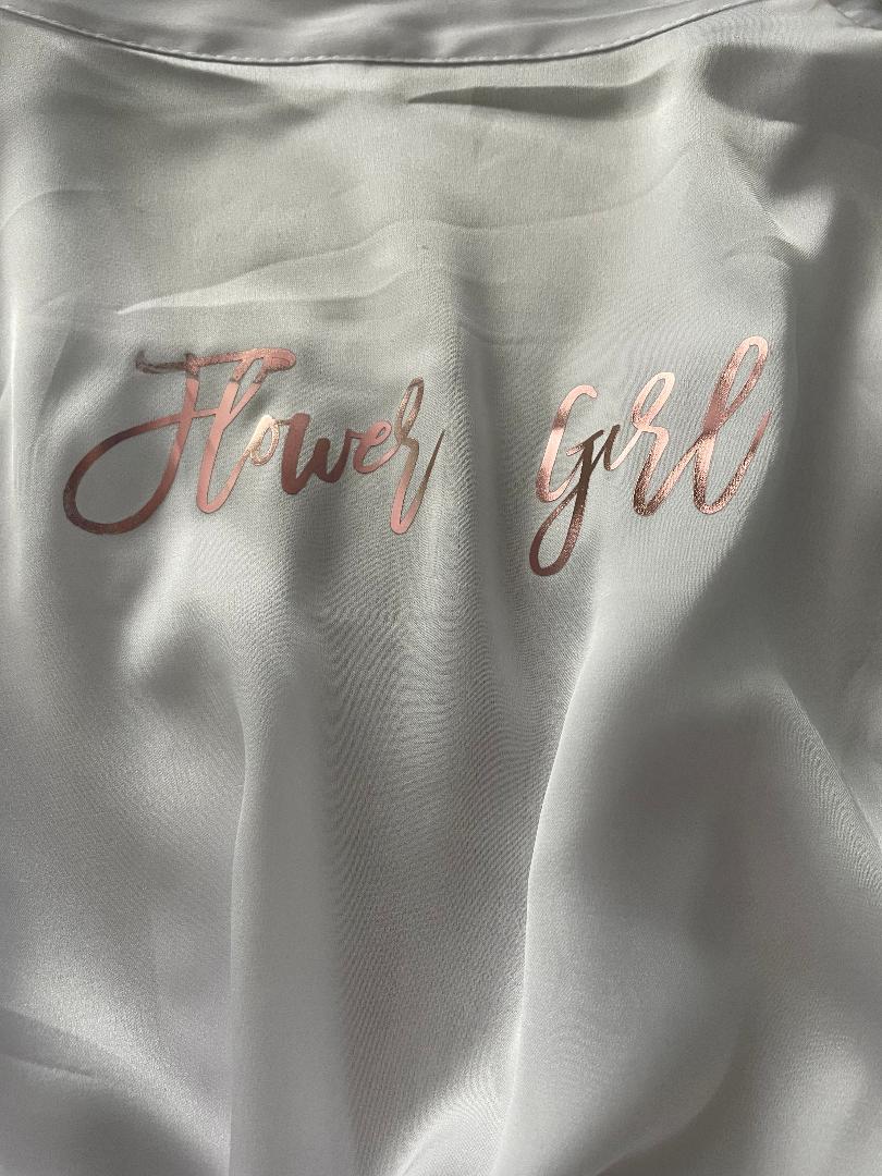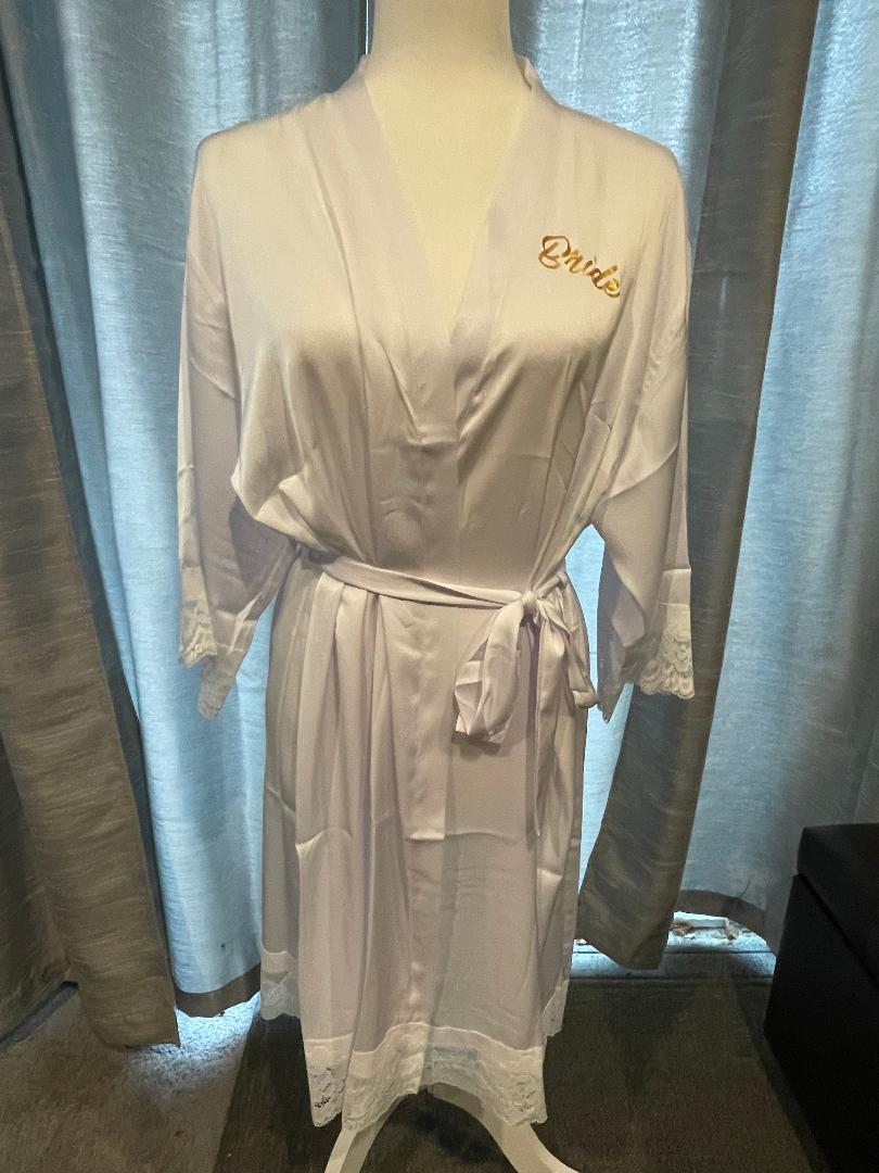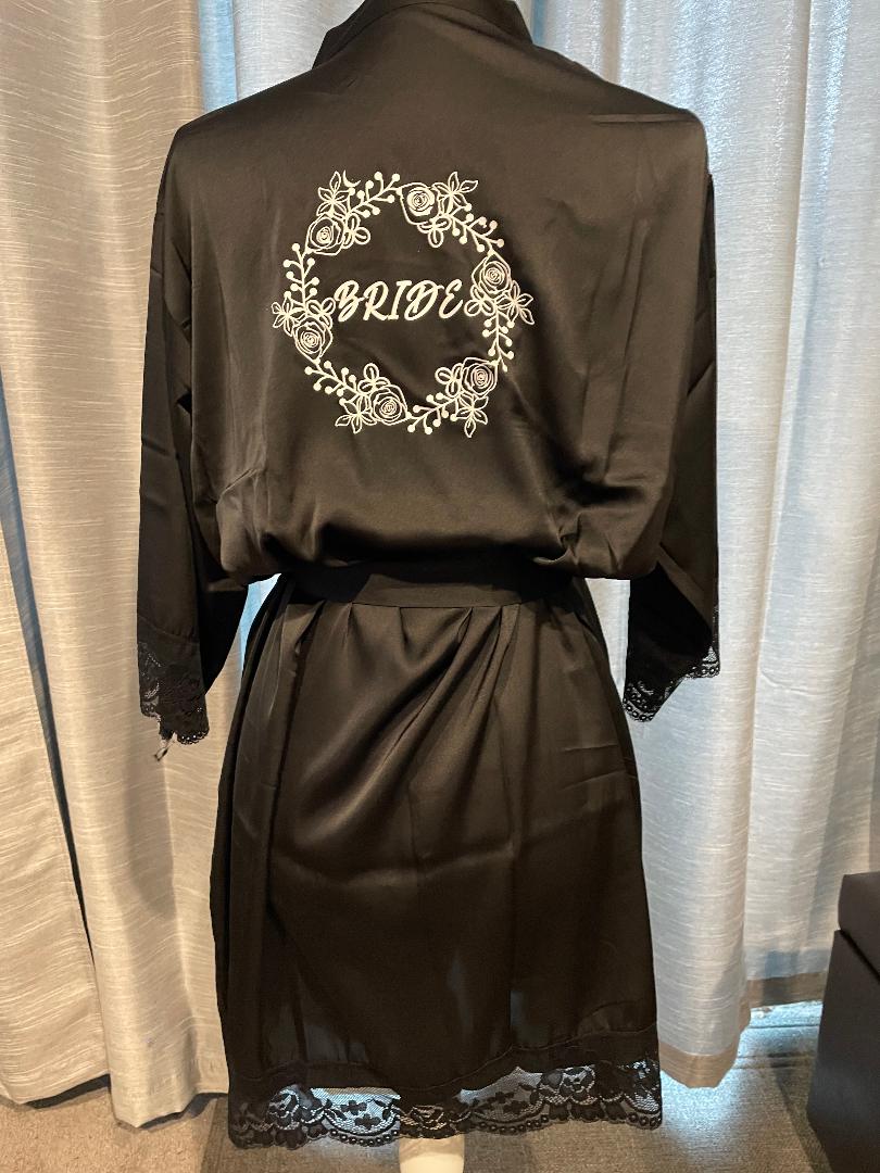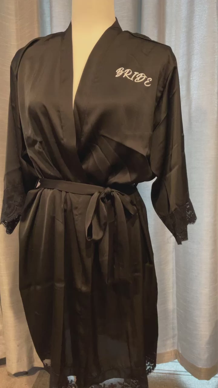 These gorgeous silk like robes are the perfect item for your bridal party. Everyone from your Bridesmaids to the Mother of the Bride will love these! They are the perfect item to slip on and wear while getting ready for the big day! These silk robes are adorned with lace around the arms and the bottom hem. They come with loops around the waist and a matching sash to tie. Custom detailed with Bride, Bridesmaid, Maid of Honor, Bride Tribe, Bride's Babes or any name front and/or back in vinyl color of your choice.
